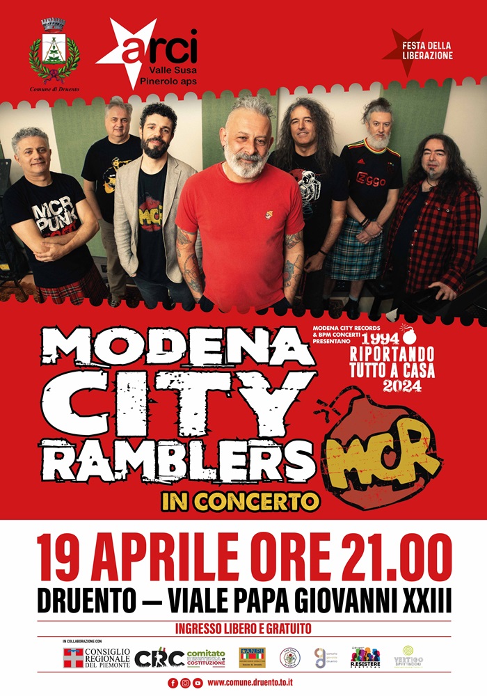 Il concerto dei Modena City Ramblers è organizzato in collaborazione con il Comitato Resistenza e Costituzione della Regione Piemonte. Commenta il Vicepresidente del Consiglio Regionale e Presidente del Comitato Resistenza e Costituzione della Regione Piemonte: «Ogni anno cerchiamo di celebrare la Festa della Liberazione non solo con le tradizionali commemorazioni istituzionali e i momenti di approfondimento storico, ma promuovendo eventi che auspichiamo servano a coinvolgere le giovani generazioni e ricordare loro che 80 anni fa, ragazzi e ragazze della loro età diedero la vita per consentire a noi, oggi, di vivere in un Paese democratico. Perché il 25 aprile è un momento di gioia e, al tempo stesso, occasione di riflessione sul nostro passato per non perdere la Memoria di ciò che è stato e farne linfa del nostro impegno per un futuro libero, giusto e pacifico. Siamo quindi orgogliosi di sostenere il concerto dei Modena City Ramblers, che nella loro decennale carriera spesso si sono ispirati alle tematiche e ai valori della Resistenza. Con il loro combat folk renderemo omaggio al “sangue resistente” versato anche a Druento».